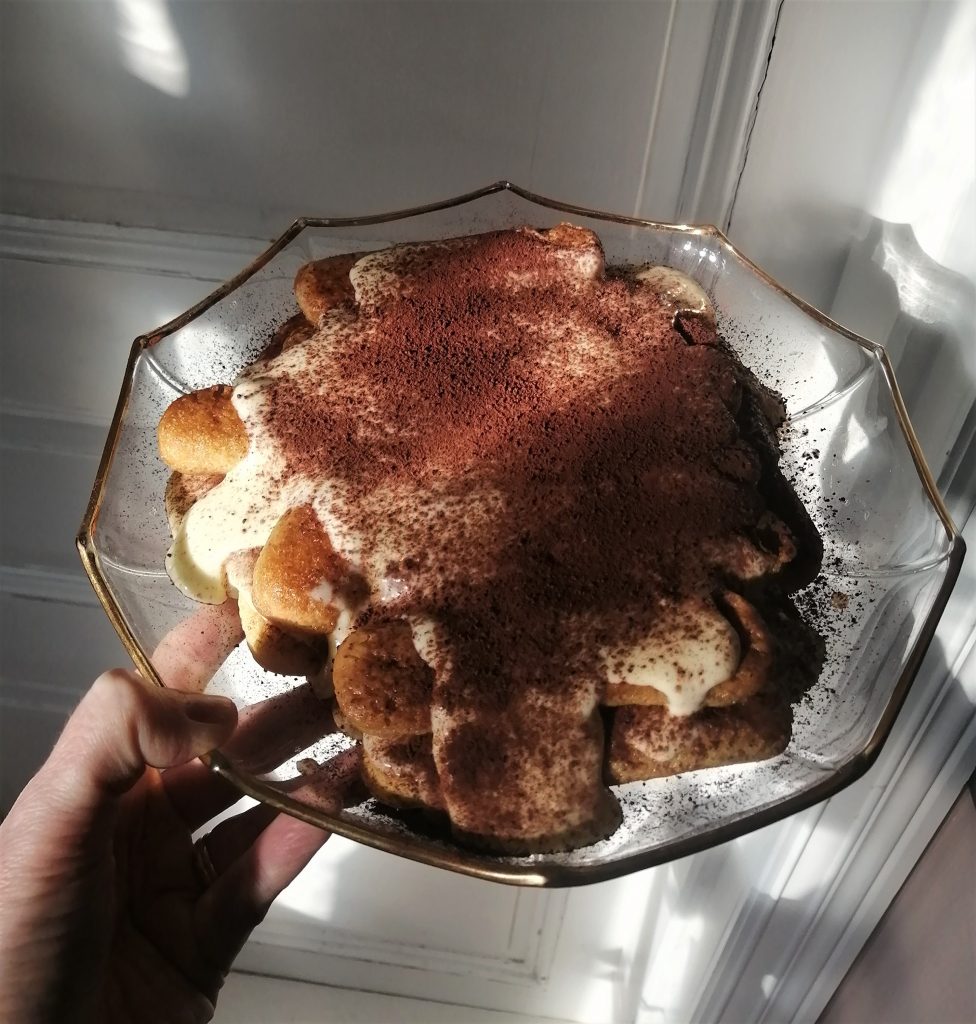 Tirami sù tarkoittaa kutakuinkin ”kohota minut”, piristä minua. Minusta tiramisu ei piristä vaan sen avulla laskeudutaan punaiselle samettisohvalle laskuvarjon avittamana, jottei töyssy pilaisi nautintoa. Täydellinen tiramisu on silkkaa samettia. Täydellisiä olen maistanut useita, tottakai eniten Sisiliassa, mutta tämä pikaversio todella yllätti minut. Kaappini ainesluettelo kun ei ollut sillä hetkellä häävi eikä oikeaoppinen. Mutta minulla oli marsalaa, minulla oli savoiardi-keskejä. Ohje pauttiarallaa: