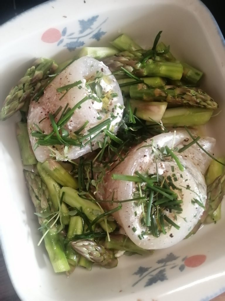 Kesällä tehty täysin suomalainen ruoka sisälsi kotimaista parsaa, kuhaa, voita ja creme fraichea. Yrtit pihalta. Tämä meni uuniin jonain sellaisena päivänä, kun sähkö oli halpaa eikä ollut helle. Etenkin kesällä on helppo ostaa vain suomalaista.