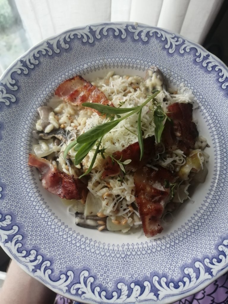 Spelttiin tehty sienirisotto, joukossa kylläkin jämät arborio-riisistä. Päällä eläin nimeltä pekoni ja yrtti pihalta. Tunnistaako joku? Se kasvaa paikassa, jossa kasvoi viime vuonna salviaa ja laventelia. Tämä on aivan kuin niiden välimuoto, onko se mahdollista? Maistuukin vähän siltä miltä tuoksuu. Vai onko kyse jostain sadasta eri salvialajikkeesta? Juusto on Gran Castelli. Täytyy keksiä parmesanin korvaava kotimainen juusto tilalle. Suosituksia?